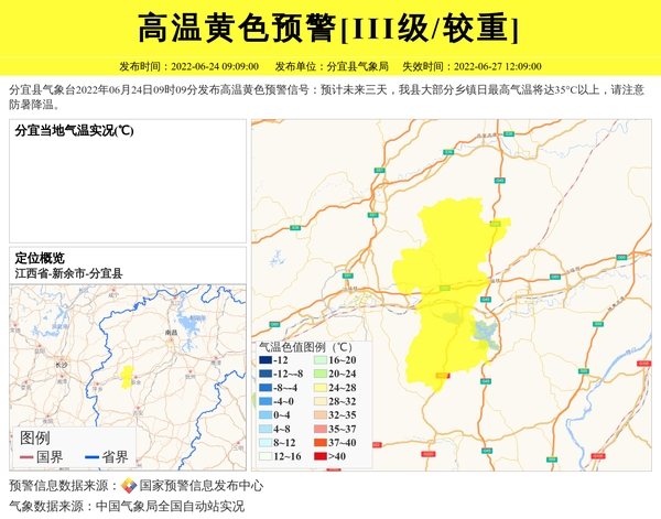 分宜县气象台2022年06月24日09时09分发布高温黄色预警信号:预计未来三天,我县大部分乡镇日最高气温将达35°C以上,请注意防暑降温。 信息来源:国家预警信息发布中心; 发布单位:分宜县气象局。