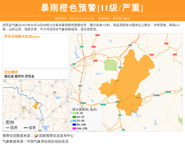 罗田县气象台2022年06月24日06时23分发布暴雨橙色预警信号:预计未来3小时,我县局部有50毫米以上降水,伴有雷电,阵风6-8级,山区山洪、地质灾害、中小河流洪水气象风险较高,请注意防范。 信息来源:国家预警信息发布中心; 发布单位:罗田县气象台。