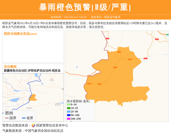 昭苏县气象局2022年6月24日17时6分发布暴雨橙色预警信号:目前,我县乌尊布拉克镇吉浪赛测站近1小时降水量已达24.2毫米,且降水天气仍将持续,可能引发局地洪水和泥石流、滑坡等地质灾害,请注意防范。 信息来源:国家预警信息发布中心; 发布单位:昭苏县气象局。