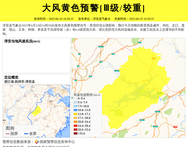 淳安县气象台2022年6月24日16时50分发布大风黄色预警信号:受强对流云团影响,预计今天傍晚到夜里我县威坪、鸠坑、左口、姜家、瑶山、王阜、梓桐、界首及千岛湖等镇(乡)有6-8级雷雨大风,请注意防范大风对设施农业、在建工程及水上交通等的不利影响。 信息来源:国家预警信息发布中心; 发布单位:淳安县气象台。