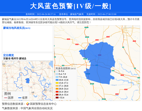 蒙城县气象台2022年06月26日00时32分发布大风蓝色预警信号。受局地对流回波影响,目前我县城关镇已出现8级大风,预计今天夜里坛城镇、板桥集镇、双涧镇等东北部乡镇可能出现7-8级的大风天气。请注意防范! 信息来源:国家预警信息发布中心; 发布单位:蒙城县气象局。