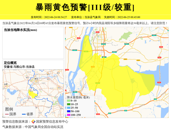 当涂县气象台2022年06月24日08时45分发布暴雨黄色预警信号。预计6小时内我县湖阳等乡镇降雨量将达50毫米以上。请注意防范! 信息来源:国家预警信息发布中心; 发布单位:当涂县气象局。