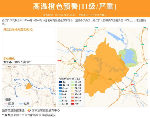 丹江口市气象台2022年06月24日07时34分发布高温橙色预警信号:预计今天白天,丹江口大部最高气温将升至37℃以上,请注意防范。 信息来源:国家预警信息发布中心; 发布单位:丹江口市气象台。