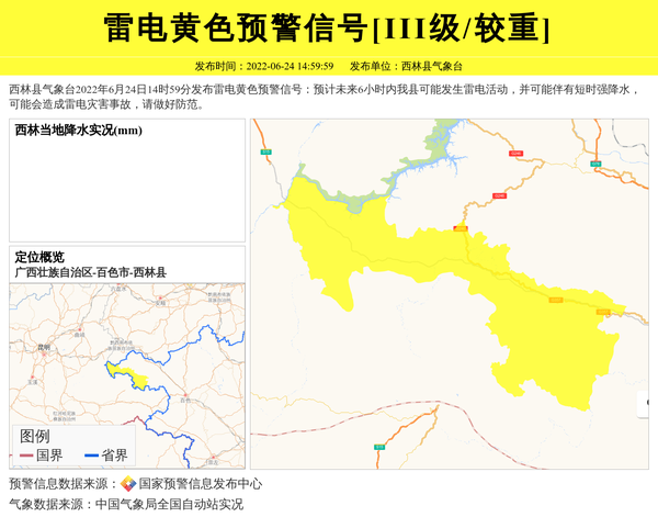 西林县气象台2022年6月24日14时59分发布雷电黄色预警信号:预计未来6小时内我县可能发生雷电活动,并可能伴有短时强降水,可能会造成雷电灾害事故,请做好防范。 信息来源:国家预警信息发布中心; 发布单位:西林县气象台。