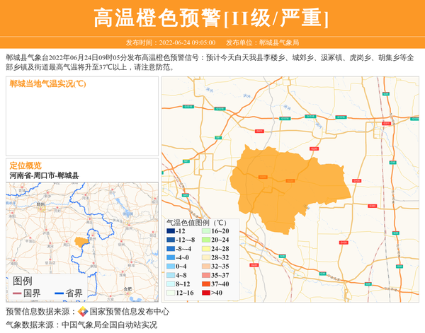 郸城县气象台2022年06月24日09时05分发布高温橙色预警信号:预计今天白天我县李楼乡、城郊乡、汲冢镇、虎岗乡、胡集乡等全部乡镇及街道最高气温将升至37℃以上,请注意防范。 信息来源:国家预警信息发布中心; 发布单位:郸城县气象局。