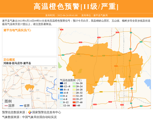 遂平县气象台2022年6月24日09时41分发布高温橙色预警信号:预计今天白天,我县嵖岈山景区、玉山镇、槐树乡等全部乡镇及街道最高气温将升至37度以上,请注意防暑降温。 信息来源:国家预警信息发布中心; 发布单位:遂平县气象局。