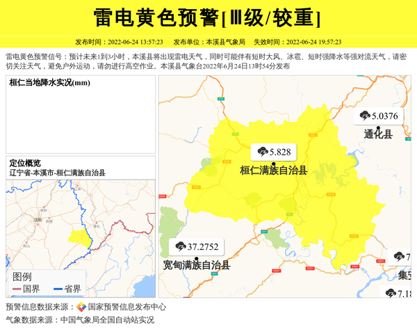 雷电黄色预警信号:预计未来1到3小时,本溪县将出现雷电天气,同时可能伴有短时大风、冰雹、短时强降水等强对流天气,请密切关注天气,避免户外运动,请勿进行高空作业。本溪县气象台2022年6月24日13时54分发布 信息来源:国家预警信息发布中心; 发布单位:本溪县气象局。