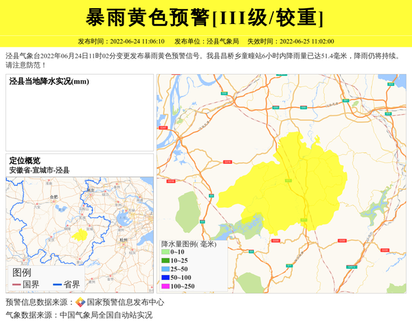 泾县气象台2022年06月24日11时02分变更发布暴雨黄色预警信号。我县昌桥乡童疃站6小时内降雨量已达51.4毫米,降雨仍将持续。请注意防范! 信息来源:国家预警信息发布中心; 发布单位:泾县气象局。