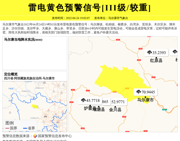 马尔康市气象台2022年06月24日19时02分发布雷电黄色预警信号:马尔康镇、松岗镇、梭磨乡、白湾乡、党坝乡、木尔宗乡、脚木足乡、沙尔宗镇、龙尔甲乡、大藏乡、康山乡、草登乡、日部乡6小时内可能发生雷电活动,可能会造成雷电灾害,过程可能伴有冰雹、阵性大风和短时强降水,请相关部门加强防范,做好防雷工作,避免户外露天活动。 信息来源:国家预警信息发布中心; 发布单位:马尔康市气象台。