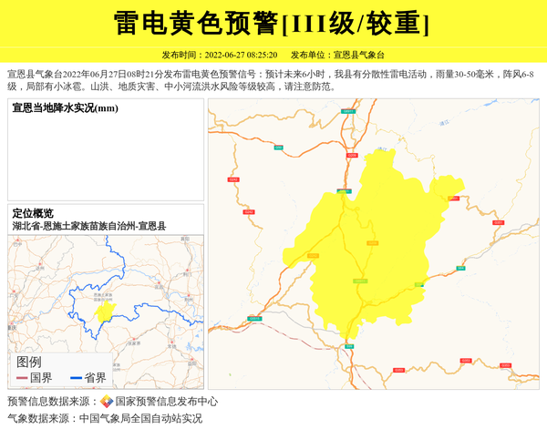 宣恩县气象台2022年06月27日08时21分发布雷电黄色预警信号:预计未来6小时,我县有分散性雷电活动,雨量30-50毫米,阵风6-8级,局部有小冰雹。山洪、地质灾害、中小河流洪水风险等级较高,请注意防范。 信息来源:国家预警信息发布中心; 发布单位:宣恩县气象台。