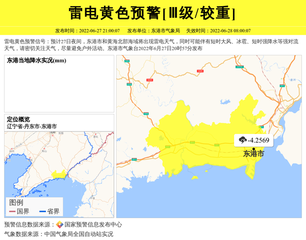 雷电黄色预警信号:预计27日夜间,东港市和黄海北部海域将出现雷电天气,同时可能伴有短时大风、冰雹、短时强降水等强对流天气,请密切关注天气,尽量避免户外活动。东港市气象台2022年6月27日20时57分发布 信息来源:国家预警信息发布中心; 发布单位:东港市气象局。
