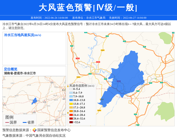 冷水江市气象台2022年6月26日14时4分发布大风蓝色预警信号:预计冷水江市未来24小时将出现6~7级大风,最大风力可达8级以上,请注意防范。 信息来源:国家预警信息发布中心; 发布单位:冷水江市气象局。