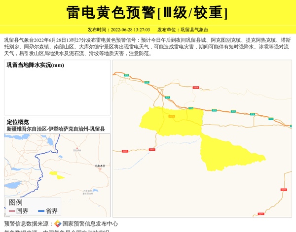 巩留县气象台2022年6月28日13时27分发布雷电黄色预警信号:预计今日午后到夜间巩留县城、阿克图别克镇、提克阿热克镇、塔斯托别乡、阿尕尔森镇、南部山区、大库尔德宁景区将出现雷电天气,可能造成雷电灾害,期间可能伴有短时强降水、冰雹等强对流天气,易引发山区局地洪水及泥石流、滑坡等地质灾害,注意防范。 信息来源:国家预警信息发布中心; 发布单位:巩留县气象台。
