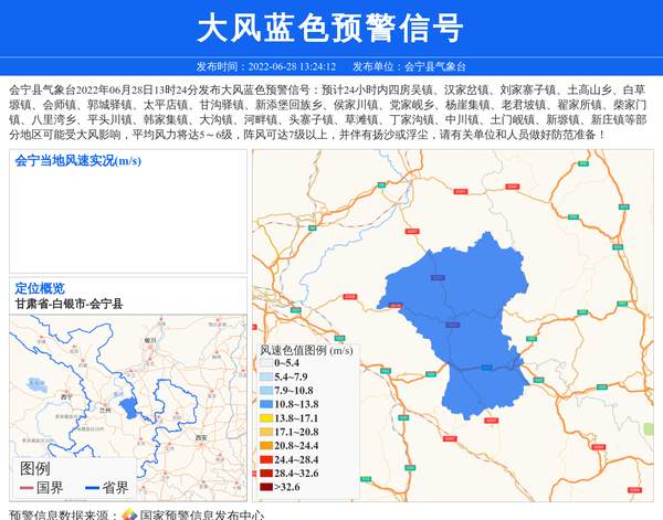 会宁县气象台2022年06月28日13时24分发布大风蓝色预警信号:预计24小时内四房吴镇、汉家岔镇、刘家寨子镇、土高山乡、白草塬镇、会师镇、郭城驿镇、太平店镇、甘沟驿镇、新添堡回族乡、侯家川镇、党家岘乡、杨崖集镇、老君坡镇、翟家所镇、柴家门镇、八里湾乡、平头川镇、韩家集镇、大沟镇、河畔镇、头寨子镇、草滩镇、丁家沟镇、中川镇、土门岘镇、新塬镇、新庄镇等部分地区可能受大风影响,平均风力将达5~6级,阵风可达7级以上,并伴有扬沙或浮尘,请有关单位和人员做好防范准备! 信息来源:国家预警信息发布中心; 发布单位:会宁县气象台。