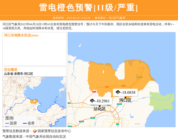 河口区气象局2022年06月28日13时43分发布雷电橙色预警信号:预计今天下午到夜间,我区全部乡镇和街道将有雷电活动,伴有8~10级雷雨大风、局地短时强降水和冰雹。请注意防范。 信息来源:国家预警信息发布中心; 发布单位:河口区气象局。