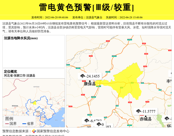 沽源县气象台2022年06月28日09时43分继续发布雷电黄色预警信号:根据最新雷达资料分析,目前我县不断有分散性的对流云过境,受其影响,预计未来6小时内,沽源县全部乡镇仍将受雷电天气影响,雷雨时可能伴有雷暴大风、冰雹、短时强降水等强对流天气,请有关单位和人员做好防范准备。 信息来源:国家预警信息发布中心; 发布单位:沽源县气象台。