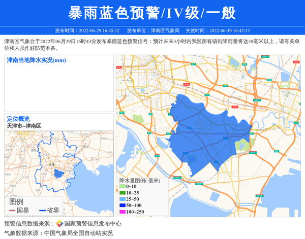 津南区气象台于2022年06月29日16时43分发布暴雨蓝色预警信号:预计未来3小时内我区所有镇街降雨量将达30毫米以上,请有关单位和人员作好防范准备。 信息来源:国家预警信息发布中心; 发布单位:津南区气象局。