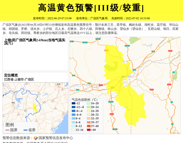 广信区气象台2022年06月29日07时33分继续发布高温黄色预警信号:预计未来三天,茶亭镇、枫岭头镇、湖村乡、花厅镇、华坛山镇、煌固镇、罗桥、清水乡、上泸镇、石人乡、石狮乡、四十八镇、田墩镇、铁山乡、望仙乡(望仙谷)、五府山镇、旭日、应家乡、皂头镇、郑坊镇、尊桥乡的部分地区日最高气温将达35°C以上,请注意防暑降温。 信息来源:国家预警信息发布中心; 发布单位:广信区气象局。
