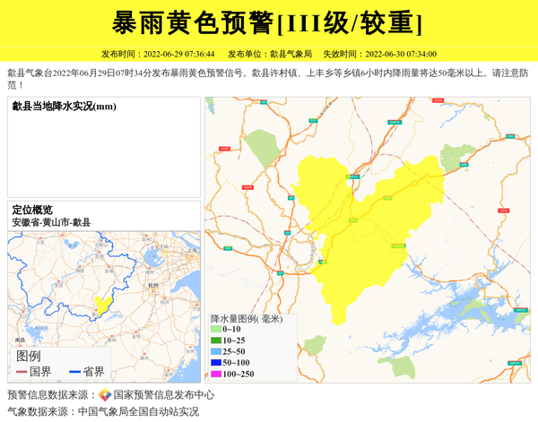 歙县气象台2022年06月29日07时34分发布暴雨黄色预警信号。歙县许村镇、上丰乡等乡镇6小时内降雨量将达50毫米以上。请注意防范! 信息来源:国家预警信息发布中心; 发布单位:歙县气象局。