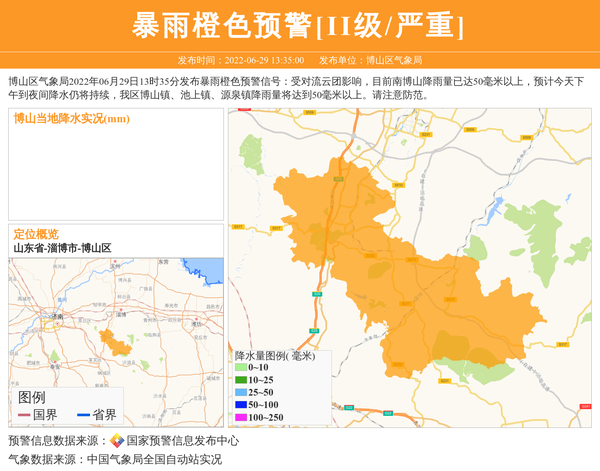 博山区气象局2022年06月29日13时35分发布暴雨橙色预警信号:受对流云团影响,目前南博山降雨量已达50毫米以上,预计今天下午到夜间降水仍将持续,我区博山镇、池上镇、源泉镇降雨量将达到50毫米以上。请注意防范。 信息来源:国家预警信息发布中心; 发布单位:博山区气象局。
