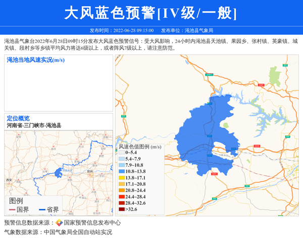 渑池县气象台2022年6月28日09时15分发布大风蓝色预警信号:受大风影响,24小时内渑池县天池镇、果园乡、张村镇、英豪镇、城关镇、段村乡等乡镇平均风力将达6级以上,或者阵风7级以上,请注意防范。 信息来源:国家预警信息发布中心; 发布单位:渑池县气象局。