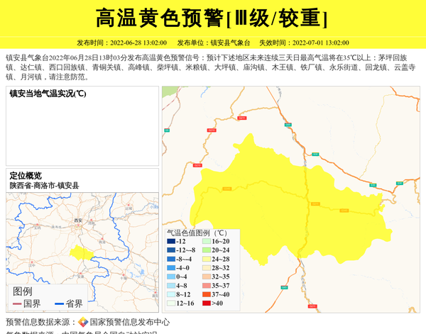 镇安县气象台2022年06月28日13时03分发布高温黄色预警信号:预计下述地区未来连续三天日最高气温将在35℃以上:茅坪回族镇、达仁镇、西口回族镇、青铜关镇、高峰镇、柴坪镇、米粮镇、大坪镇、庙沟镇、木王镇、铁厂镇、永乐街道、回龙镇、云盖寺镇、月河镇,请注意防范。 信息来源:国家预警信息发布中心; 发布单位:镇安县气象台。