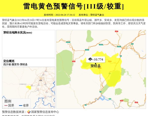 荥经县气象台2022年06月28日17时36分发布雷电黄色预警信号:目前我县牛背山镇、泗坪乡、安靖乡、龙苍沟镇已经出现分散的强回波,预计未来6小时内可能发生雷电活动,可能会造成雷电灾害事故。请有关部门和乡镇做好防雷、防风等工作,密切关注天气变化,雷雨期间尽量避免户外活动。 信息来源:国家预警信息发布中心; 发布单位:荥经县气象台。