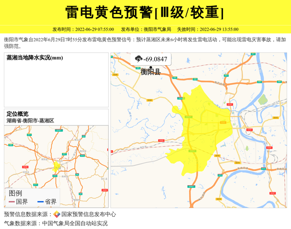 衡阳市气象台2022年6月29日7时55分发布雷电黄色预警信号:预计蒸湘区未来6小时将发生雷电活动,可能出现雷电灾害事故,请加强防范。 信息来源:国家预警信息发布中心; 发布单位:衡阳市气象局。