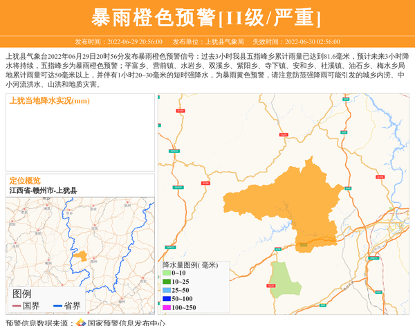 上犹县气象台2022年06月29日20时56分发布暴雨橙色预警信号:过去3小时我县五指峰乡累计雨量已达到81.6毫米,预计未来3小时降水将持续,五指峰乡为暴雨橙色预警;平富乡、营前镇、水岩乡、双溪乡、紫阳乡、寺下镇、安和乡、社溪镇、油石乡、梅水乡局地累计雨量可达50毫米以上,并伴有1小时20~30毫米的短时强降水,为暴雨黄色预警,请注意防范强降雨可能引发的城乡内涝、中小河流洪水、山洪和地质灾害。 信息来源:国家预警信息发布中心; 发布单位:上犹县气象局。