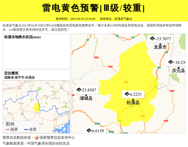 松溪县气象台2022年06月29日22时54分继续发布雷电黄色预警信号:预计未来6小时内我县有雷电活动,雷雨时局地伴有短时强降水、6-8级雷雨大风等强对流天气,请注意防范! 信息来源:国家预警信息发布中心; 发布单位:松溪县气象台。