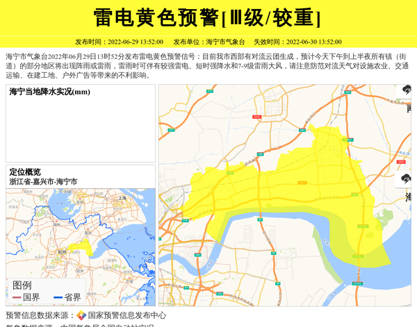 海宁市气象台2022年06月29日13时52分发布雷电黄色预警信号:目前我市西部有对流云团生成,预计今天下午到上半夜所有镇(街道)的部分地区将出现阵雨或雷雨,雷雨时可伴有较强雷电、短时强降水和7-9级雷雨大风,请注意防范对流天气对设施农业、交通运输、在建工地、户外广告等带来的不利影响。 信息来源:国家预警信息发布中心; 发布单位:海宁市气象台。