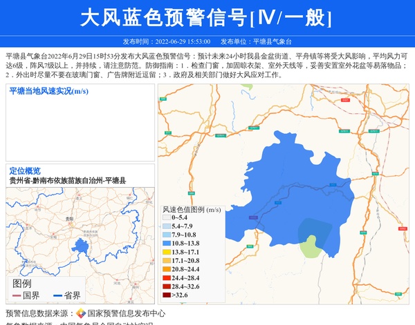 平塘县气象台2022年6月29日15时53分发布大风蓝色预警信号:预计未来24小时我县金盆街道、平舟镇等将受大风影响,平均风力可达6级,阵风7级以上,并持续,请注意防范。防御指南:1.检查门窗,加固晾衣架、室外天线等,妥善安置室外花盆等易落物品;2.外出时尽量不要在玻璃门窗、广告牌附近逗留;3.政府及相关部门做好大风应对工作。 信息来源:国家预警信息发布中心; 发布单位:平塘县气象台。
