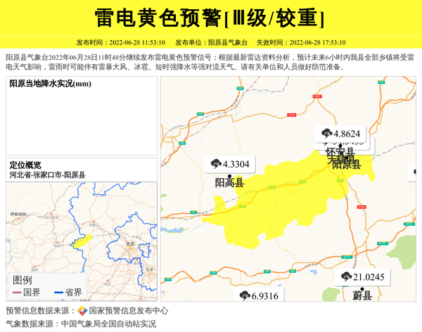 阳原县气象台2022年06月28日11时48分继续发布雷电黄色预警信号:根据最新雷达资料分析,预计未来6小时内我县全部乡镇将受雷电天气影响,雷雨时可能伴有雷暴大风、冰雹、短时强降水等强对流天气。请有关单位和人员做好防范准备。 信息来源:国家预警信息发布中心; 发布单位:阳原县气象台。