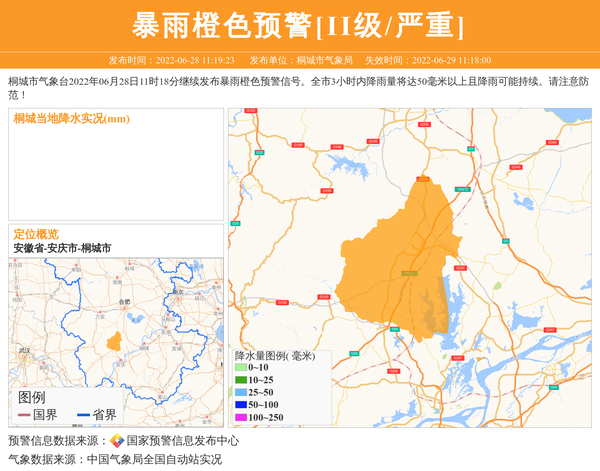 桐城市气象台2022年06月28日11时18分继续发布暴雨橙色预警信号。全市3小时内降雨量将达50毫米以上且降雨可能持续。请注意防范! 信息来源:国家预警信息发布中心; 发布单位:桐城市气象局。