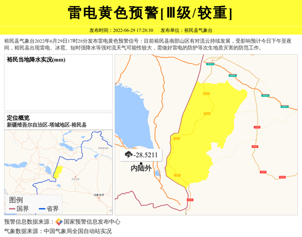 裕民县气象台2022年6月29日17时28分发布雷电黄色预警信号:目前裕民县南部山区有对流云持续发展,受影响预计今日下午至夜间,裕民县出现雷电、冰雹、短时强降水等强对流天气可能性较大,需做好雷电的防护等次生地质灾害的防范工作。 信息来源:国家预警信息发布中心; 发布单位:裕民县气象台。