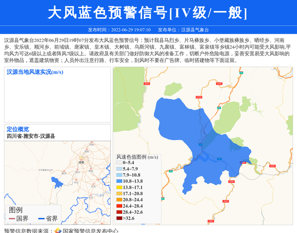 汉源县气象台2022年06月29日19时07分发布大风蓝色预警信号:预计我县马烈乡、片马彝族乡、小堡藏族彝族乡、晒经乡、河南乡、安乐镇、顺河乡、前域镇、唐家镇、皇木镇、大树镇、乌斯河镇、九襄镇、富林镇、富泉镇等乡镇24小时内可能受大风影响,平均风力可达6级以上或者阵风7级以上。请政府及有关部门做好防御大风的准备工作,切断户外危险电源,妥善安置易受大风影响的室外物品,遮盖建筑物资;人员外出注意行路、行车安全,刮风时不要在广告牌、临时搭建物等下面逗留。 信息来源:国家预警信息发布中心; 发布单位:汉源县气象台。
