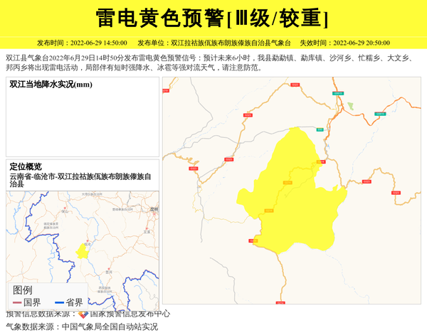 双江县气象台2022年6月29日14时50分发布雷电黄色预警信号:预计未来6小时,我县勐勐镇、勐库镇、沙河乡、忙糯乡、大文乡、邦丙乡将出现雷电活动,局部伴有短时强降水、冰雹等强对流天气,请注意防范。 信息来源:国家预警信息发布中心; 发布单位:双江拉祜族佤族布朗族傣族自治县气象台。