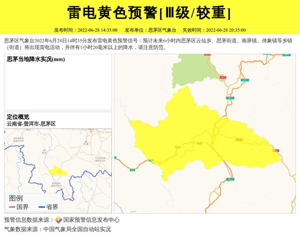 思茅区气象台2022年6月28日14时35分发布雷电黄色预警信号:预计未来6小时内思茅区云仙乡、思茅街道、南屏镇、倚象镇等乡镇(街道)将出现雷电活动,并伴有1小时20毫米以上的降水,请注意防范。 信息来源:国家预警信息发布中心; 发布单位:思茅区气象台。