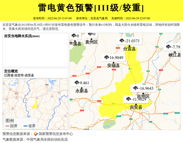吉安县气象台2022年06月29日13时07分发布雷电黄色预警信号:预计未来6小时内,我县大部分乡镇有雷电活动,局地伴有短时强降水、雷暴大风等强对流天气,请注意防范。 信息来源:国家预警信息发布中心; 发布单位:吉安县气象局。