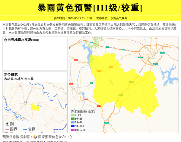 永吉县气象台2022年6月29日23时10分发布暴雨黄色预警信号:目前我县口前镇已出现大到暴雨天气,且降雨仍在持续,预计未来6小时我县仍有中雨,部分地方有大雨,口前镇、西阳镇、双河镇和北大湖镇等乡镇雨量较大,中小河流洪水、山洪和地质灾害风险高,永吉县应急管理局与永吉县气象局联合提醒注意做好预防工作。 信息来源:国家预警信息发布中心; 发布单位:永吉县气象局。