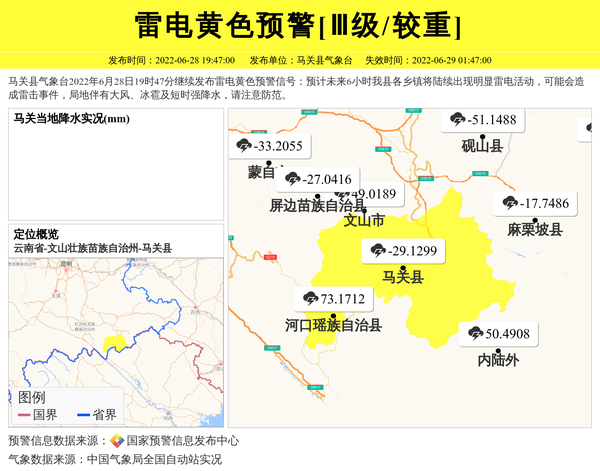 马关县气象台2022年6月28日19时47分继续发布雷电黄色预警信号:预计未来6小时我县各乡镇将陆续出现明显雷电活动,可能会造成雷击事件,局地伴有大风、冰雹及短时强降水,请注意防范。 信息来源:国家预警信息发布中心; 发布单位:马关县气象台。