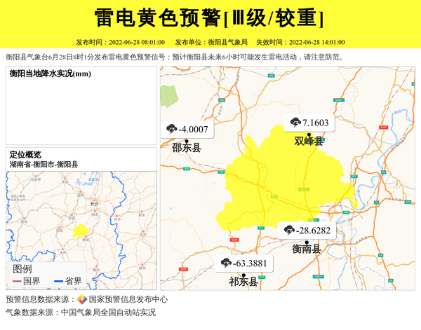 衡阳县气象台6月28日8时1分发布雷电黄色预警信号:预计衡阳县未来6小时可能发生雷电活动,请注意防范。 信息来源:国家预警信息发布中心; 发布单位:衡阳县气象局。