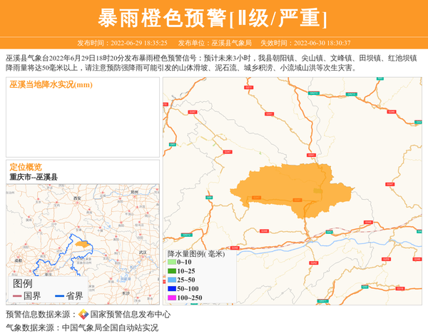 巫溪县气象台2022年6月29日18时20分发布暴雨橙色预警信号:预计未来3小时,我县朝阳镇、尖山镇、文峰镇、田坝镇、红池坝镇降雨量将达50毫米以上,请注意预防强降雨可能引发的山体滑坡、泥石流、城乡积涝、小流域山洪等次生灾害。 信息来源:国家预警信息发布中心; 发布单位:巫溪县气象局。