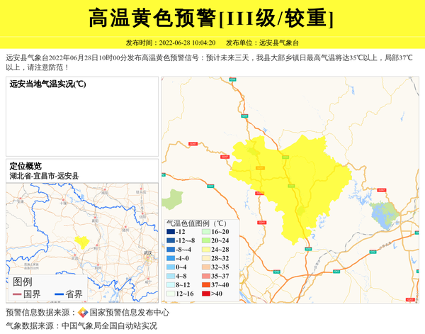 远安县气象台2022年06月28日10时00分发布高温黄色预警信号:预计未来三天,我县大部乡镇日最高气温将达35℃以上,局部37℃以上,请注意防范! 信息来源:国家预警信息发布中心; 发布单位:远安县气象台。