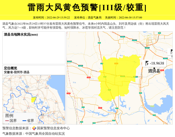 泗县气象台2022年06月29日15时57分发布雷雨大风黄色预警信号。未来6小时内我县山头、刘圩及周边镇(街)将出现雷雨大风天气,风力达7~8级,影响时并可能伴有强雷电、短时强降水、冰雹等强对流天气,请注意防范! 信息来源:国家预警信息发布中心; 发布单位:泗县气象局。