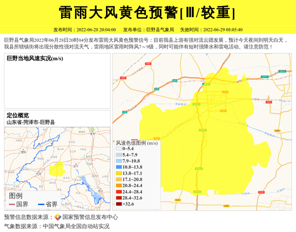 巨野县气象局2022年06月28日20时04分发布雷雨大风黄色预警信号:目前我县上游有强对流云团发展,预计今天夜间到明天白天,我县所辖镇街将出现分散性强对流天气,雷雨地区雷雨时阵风7~9级,同时可能伴有短时强降水和雷电活动。请注意防范! 信息来源:国家预警信息发布中心; 发布单位:巨野县气象局。