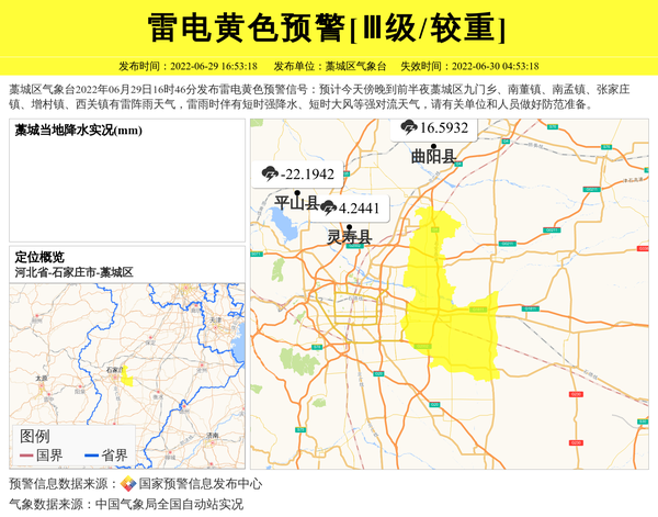 藁城区气象台2022年06月29日16时46分发布雷电黄色预警信号:预计今天傍晚到前半夜藁城区九门乡、南董镇、南孟镇、张家庄镇、增村镇、西关镇有雷阵雨天气,雷雨时伴有短时强降水、短时大风等强对流天气,请有关单位和人员做好防范准备。 信息来源:国家预警信息发布中心; 发布单位:藁城区气象台。