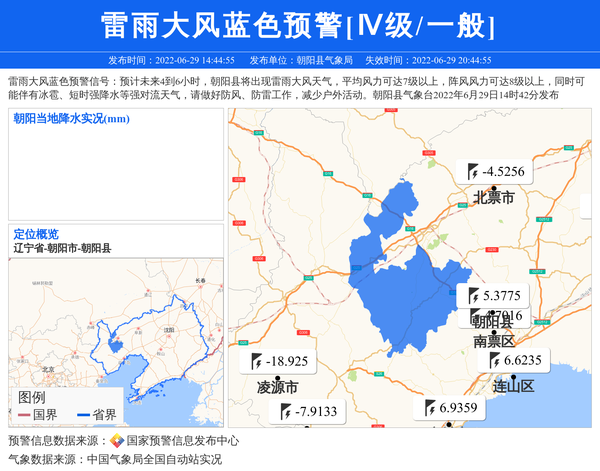 雷雨大风蓝色预警信号:预计未来4到6小时,朝阳县将出现雷雨大风天气,平均风力可达7级以上,阵风风力可达8级以上,同时可能伴有冰雹、短时强降水等强对流天气,请做好防风、防雷工作,减少户外活动。朝阳县气象台2022年6月29日14时42分发布 信息来源:国家预警信息发布中心; 发布单位:朝阳县气象局。