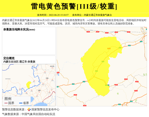 内蒙古通辽市奈曼旗气象台2022年06月28日15时09分发布雷电黄色预警信号:6小时内奈曼旗可能发生雷电活动,局部地区伴有短时强降水、雷暴大风、冰雹等强对流天气,可能造成雷电、洪涝、城市内涝等灾害事故。请有关单位和人员做好防范准备。 信息来源:国家预警信息发布中心; 发布单位:内蒙古通辽市奈曼旗气象台。