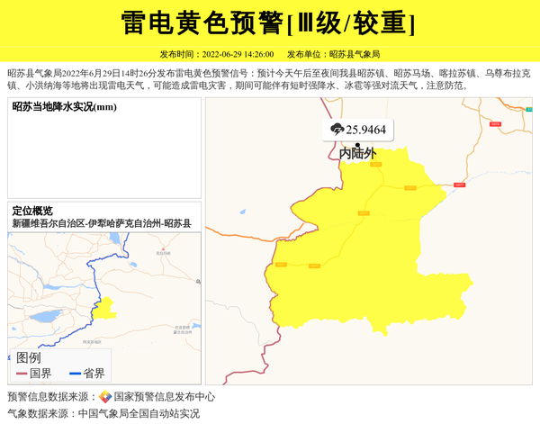 昭苏县气象局2022年6月29日14时26分发布雷电黄色预警信号:预计今天午后至夜间我县昭苏镇、昭苏马场、喀拉苏镇、乌尊布拉克镇、小洪纳海等地将出现雷电天气,可能造成雷电灾害,期间可能伴有短时强降水、冰雹等强对流天气,注意防范。 信息来源:国家预警信息发布中心; 发布单位:昭苏县气象局。